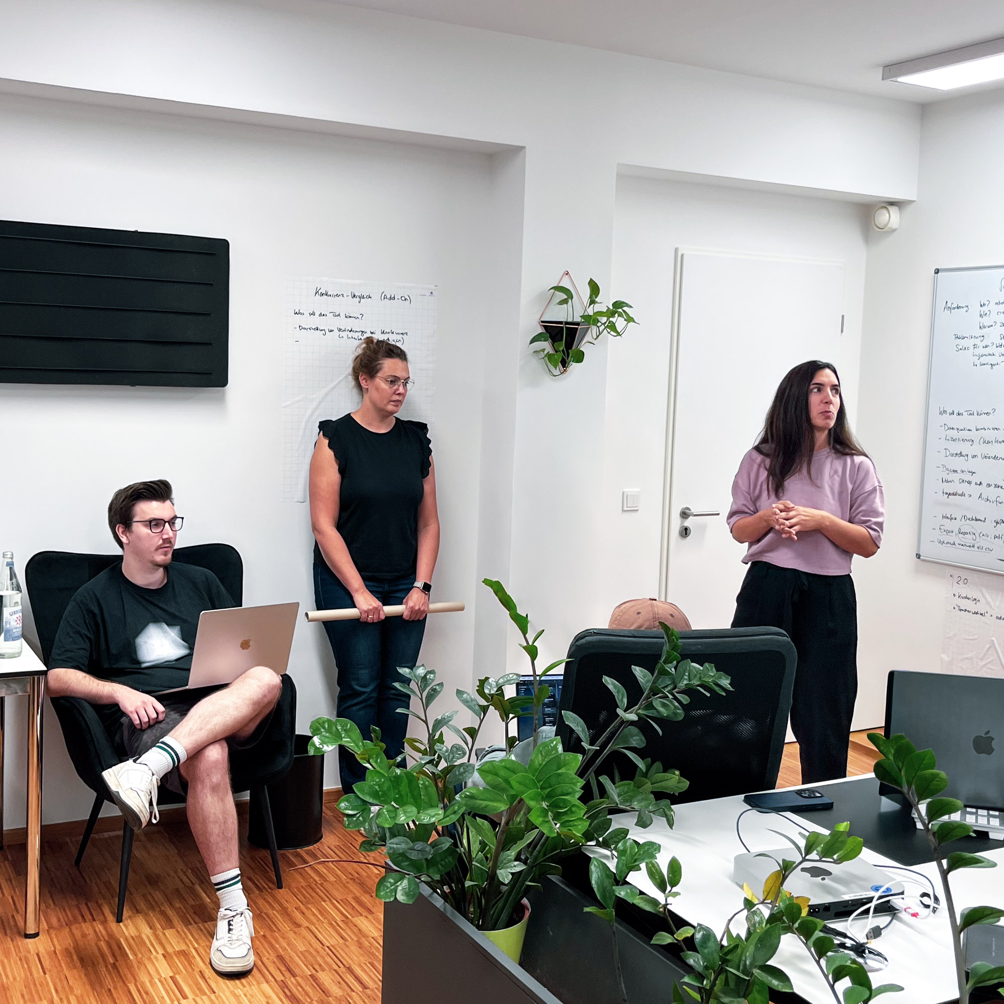 Anschließend ging es in den Schlussspurt und die einzelnen Teams bereiteten sich auf die Präsentation vor. Hier war wieder das Online-Marketing-Team gefragt: „Welche Punkte machen unser Tool einzigartig, wie vermitteln wir das nach außen – und wie viel Erklärung braucht es dafür?“ Am Nachmittag war es dann soweit: Das Team stellte den Prototyp vor – noch nicht perfekt, aber funktional und der Beweis dafür, was in nur fünf Tagen möglich ist!