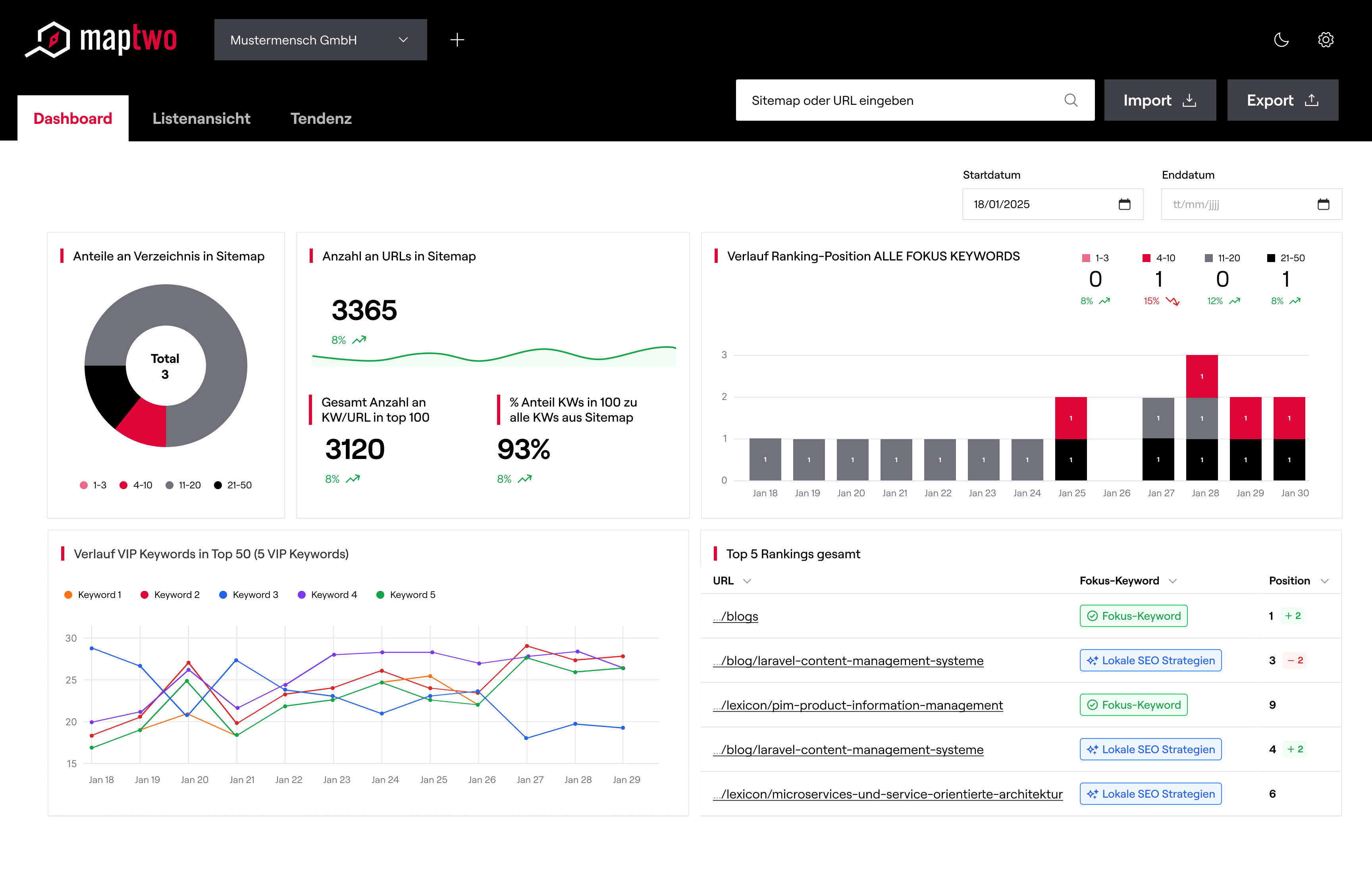 Das Ergebnis dieser Überlegungen war ein erster Dashboard-Entwurf, der konkrete KPIs festlegte. Gleichzeitig machte es sichtbar, welche Daten erhoben werden müssen und wie wir sie sinnvoll visualisieren können. Ebenfalls dachten wir darüber nach, wie KI später nicht nur Daten liefert, sondern Nutzer aktiv unterstützen kann. Möglicherweise durch automatisierte Empfehlungen oder Hinweise auf SEO-Potenziale direkt im Interface.